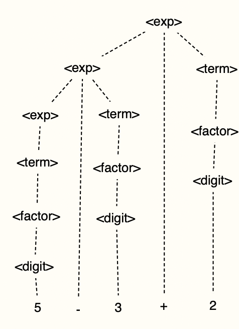 <exp> ::= <exp>+<ex[> | <exp>-<exp> | <exp>*<exp> | <exp>/<exp> | (<exp>) | <digit>