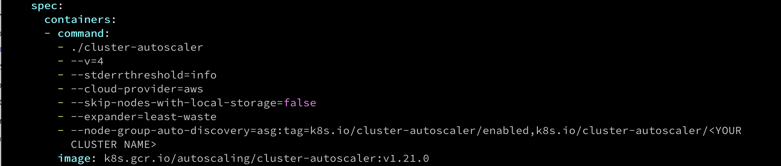 $ kubectl apply -f https://raw.githubusercontent.com/kubernetes/autoscaler/master/cluster-autoscaler/cloudprovider/aws/examples/cluster-autoscaler-autodiscover.yaml